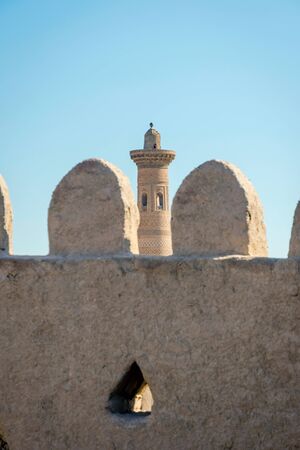 Old city wall and minaret made of mud, Khiva old town, Uzbekistan