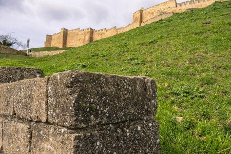 Ancient stone blocks form a wall. An ancient fortress is visible behind the ancient wall. The masonry of the stones forms a wall. An ancient fortress to protect people from attacks.