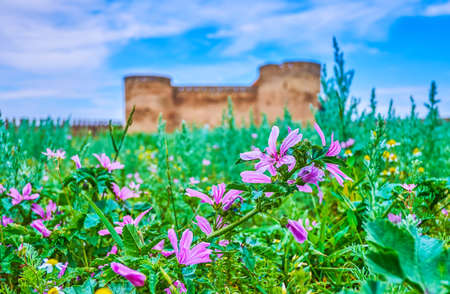 The courtyard of Akkerman Fortress with a view of lawn, wildflowers, ramparts and the Citadel in background, Bilhorod-Dnistrovskyi, Ukraine