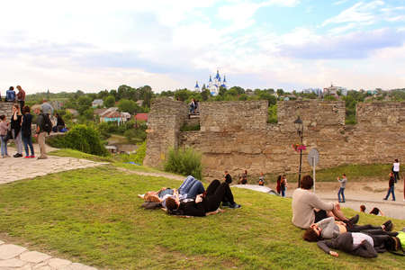 Unidentified tourists are waiting for festival of air balloons with a ballooning annual show in Kamianets-Podilskyi