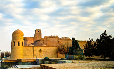 Exterior view to Ota-Darvoza gate and Statue of Muhammad ibn Musa al-Khwarizmi at Khiva, Uzbekistan