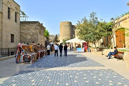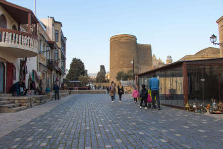 The family walking in the streets of Baku - Azerbaijan: 2 Aprel 2021. Maiden Tower in Icherisheher.
