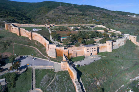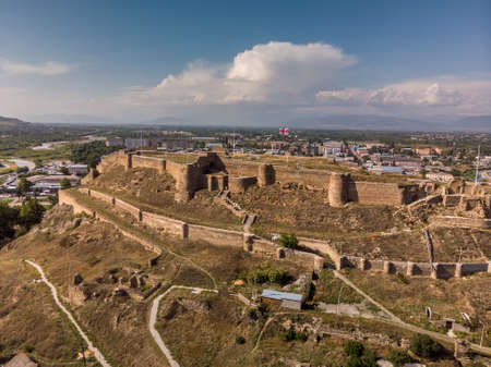 Aerial view of medieval castle complex Rabati in Akhaltsikhe. Restored fortress Rabat with tower on rock. Old ruin famous georgian touristic places. ancient Lomisa built in IX century. Georgia, Europe