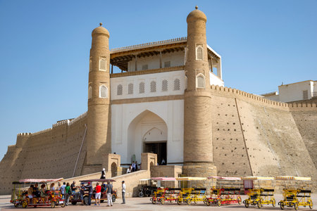 BUKHARA, UZBEKISTAN - SEPTEMBER 09, 2022: Bicycle cars with tourists at the old Ark fortress. Bukhara, Uzbekistan