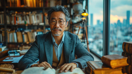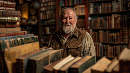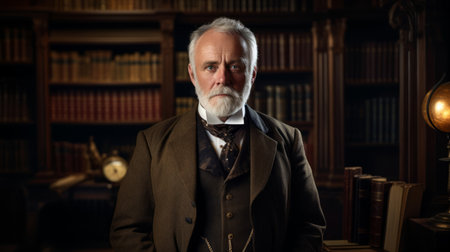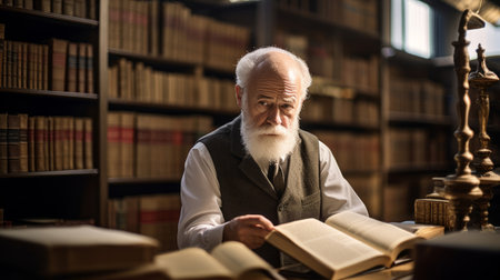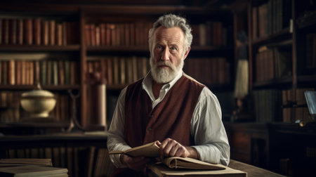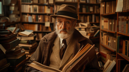 Scholarly university professor in a library, symbolizing higher education and academia.