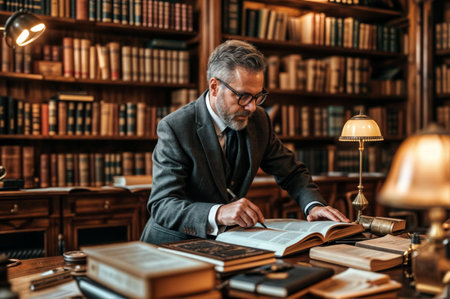 Businessman studying data in a vintage library setting