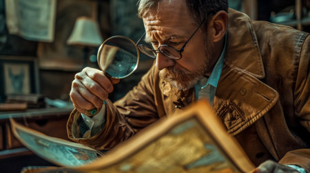 Antiquarian inspecting old map with magnifying glass