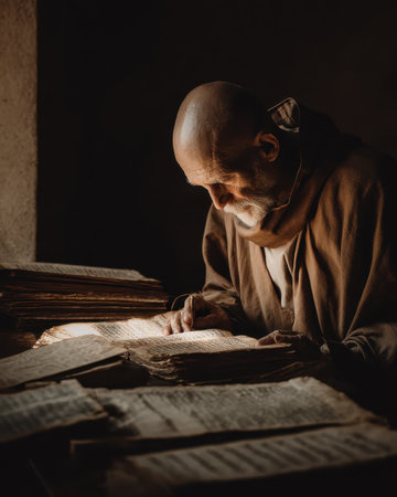 Elder monk studies ancient manuscript by warm light inside austere cell. AI-generated.