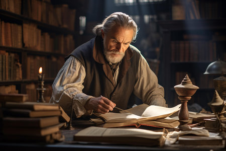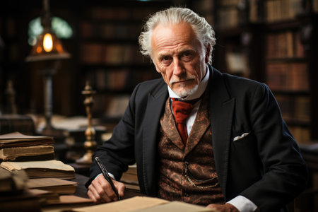 Archivist in vintage library with quill pen