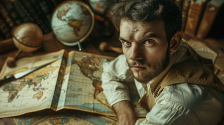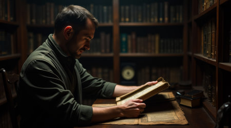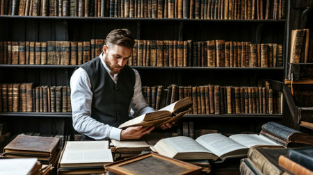 A man immersed in reading antique books in a vintage library. The warm ambiance and shelves filled with old volumes create a serene atmosphere for learning and exploration.