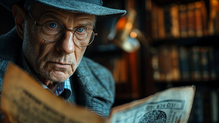 Portrait of an elderly man reading a newspaper in a library.