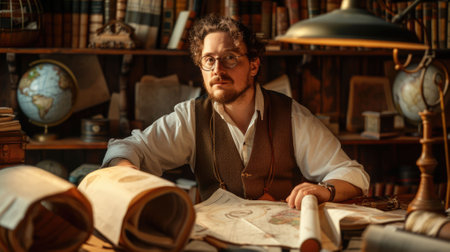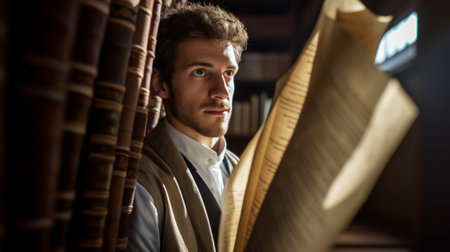 Inquisitive bibliographer with ancient scrolls