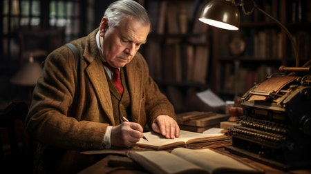 Elderly writer reads work at vintage typewriter