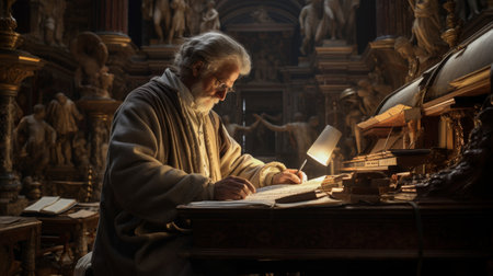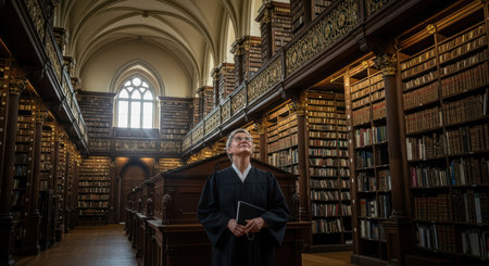 Elderly male scholar in historic library surrounded by antique books and architecture