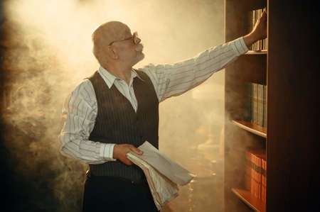 Elderly writer at the bookcase in home office