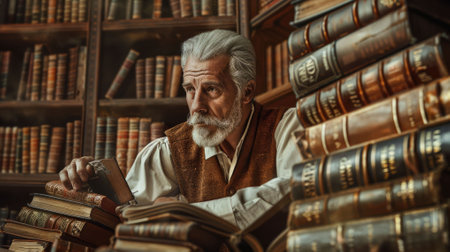 Elderly scholar browsing books in a grand library. Knowledge and wisdom.