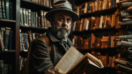 Bearded man engrossed in reading a book, with a vintage library background