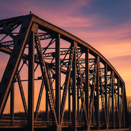 Metal truss bridge spanning a calm river with stunning reflections and warm sunset colors