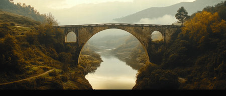 Cinematic view of a majestic bridge spanning a serene river in a lush valley landscape