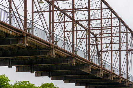 fragment of a steel bridge across the river. The skin plates contain many pimple protrusions. Selective focus macro shot with shallow DOF