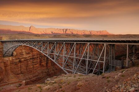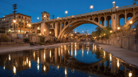 A bridge arches over a calm river, bathed in the soft light of dusk with mountains looming in the distance. The setting sun filters through, creating a serene atmosphere around the sturdy structure. AI generation
