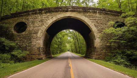 Old stone bridge over a rural road in the woods of Pennsylvania.