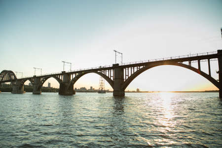 Railway bridge at sunset. Railway bridge over the river. Railway bridge.