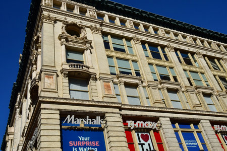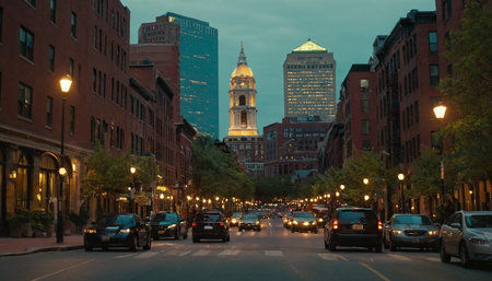 Boston, USA - September 12, 2017: people and traffic at South station in Boston. Modern and historic buildings in Boston side by side give a harmonic skyline.