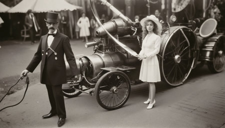 A man in a black suit and top hat stands confidently beside a vintage steam-powered fire engine. His attire includes a bow tie and a watch chain, exuding a style reminiscent of the early 20th century. Next to the man, a woman in a white dress and wide-brimmed hat poses gracefully, adding a contrasting elegance to the industrial machinery. The steam engine, with its large wheels and metal pipes, highlights the engineering marvels of the past. In the background, a tent and a small crowd create a lively atmosphere, suggesting a public exhibition or fair. The monochromatic color scheme enhances the historical feel of the image, transporting the viewer to a bygone era.