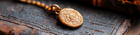 A close up of gold medal resting on polished wooden surface, reflecting light beautifully, symbolizing achievement and success