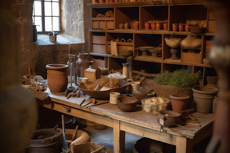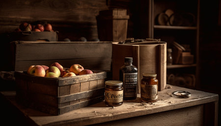 Rustic wooden shelf holds antique medicine bottles and herbal remedies generated by artificial intelligence