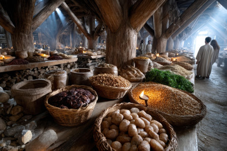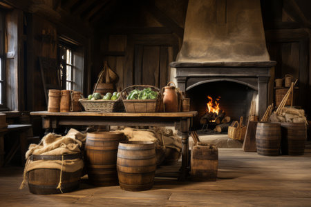 An enchanting images showcasing the rustic charm of grain-filled baskets and wooden barrels. Generative Ai