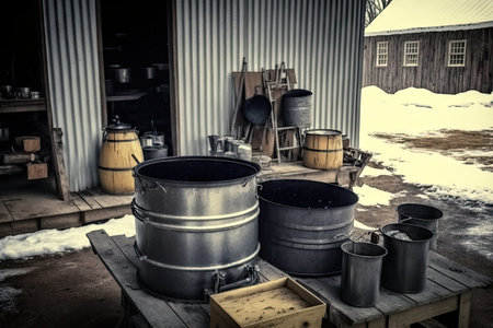 evaporator set up for small-scale maple syrup production, with cooking pots and buckets ready to go, created with generative ai