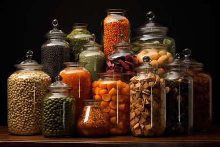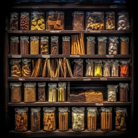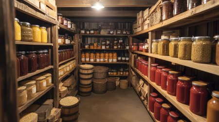 Well-organized pantry filled with various jars of dried goods and preserved foods in a rustic cellar. Generative AI