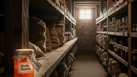 A basement shelf packed with jars of preserved fruits, vegetables, and dried pasta, illuminated by a soft, warm glow