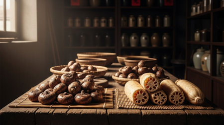 An environmental, cinematic wide shot capturing the ingredients for traditional lotus seed paste des