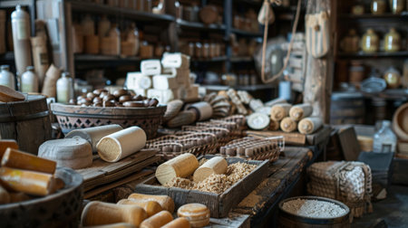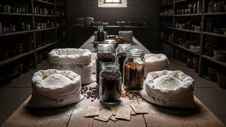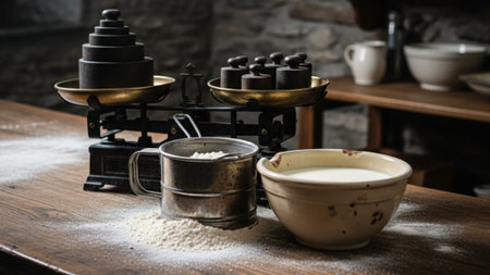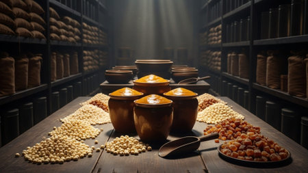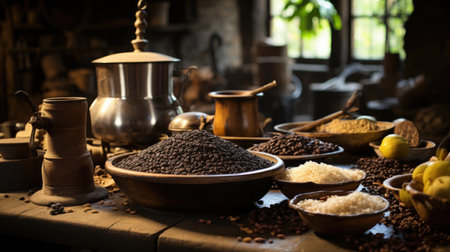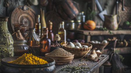 Rustic kitchen scene featuring a variety of ingredients and utensils, including grains, spices, and pottery. The vintage setting adds a warm, nostalgic atmosphere.