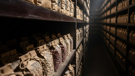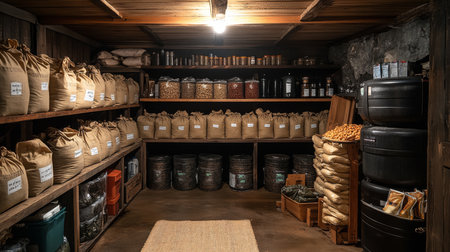 Well-organized storage room filled with bags of grains, spices, and canned goods in a rustic setting. Generative AI