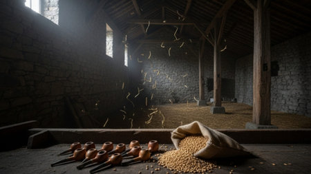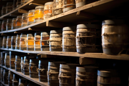 A detailed image of rustic wooden barrels and glass jars filled with various grains in a traditional store setting. The vintage atmosphere and warm lighting highlight the charm of old-fashioned trade and craftsmanship.