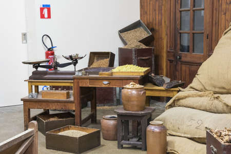 Several containers with herbs to brew the liquor of the Benedictine abbey on display in the brewery