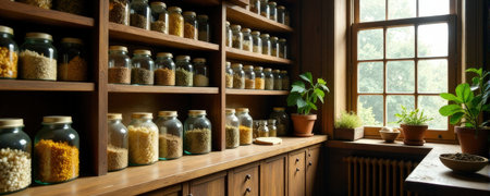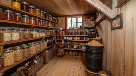 A rustic kitchen pantry with shelves lined with jars of grains, spices, and dry goods. The natural tones and simple design evoke a traditional, homely atmosphere.