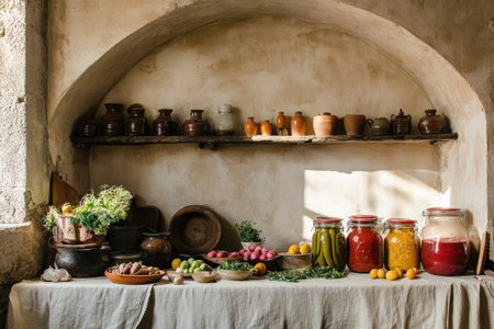 Rustic kitchen scene featuring a wooden table adorned with vibrant jars filled with preserves, fresh vegetables, and herbs, creating a warm and inviting atmosphere for culinary inspiration