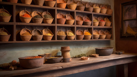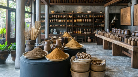 Explore a tranquil interior of a traditional spice shop with diverse spices and herbs beautifully arranged in natural wooden settings, perfect for culinary inspirations.