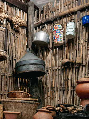 Variety and types of utensils for simple cooking of Asian families in the past. Traditional Asia and Thai old kitchen style interior. Antique kitchen with utensils at bamboo cottage. Selective focus.