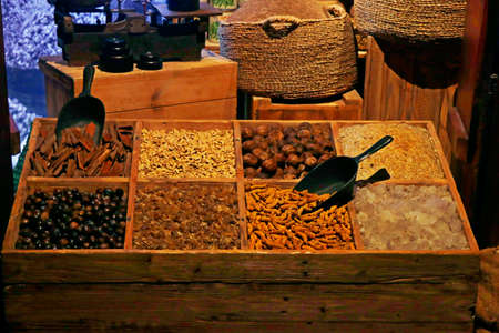 Assortment of jars filled with dried herbs, spices, and grains on a rustic market display, evoking a cozy and traditional atmosphere.