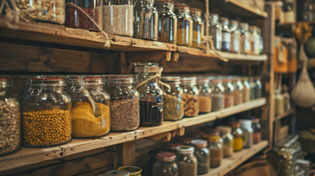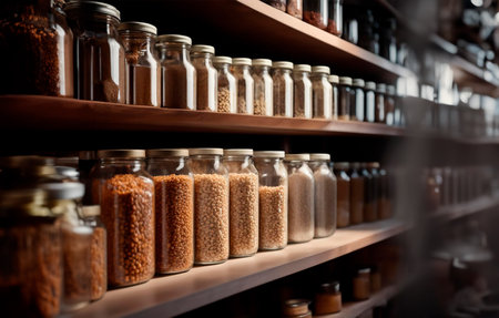 Organized pantry: Shelves neatly lined with glass jars filled with dry foods such as pasta, grains, and legumes, showcasing a well-stocked kitchen