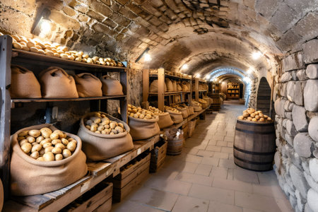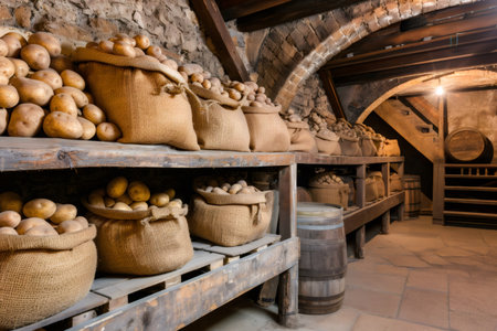 Sacks of harvested potatoes filling a rustic stone cellar with wooden shelves