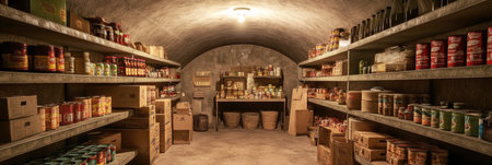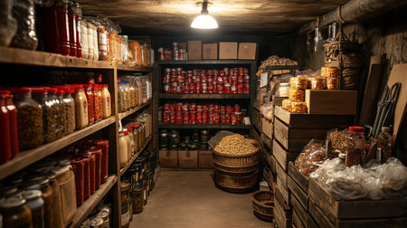 Vintage storage room filled with jars and containers of various preserved foods in a rustic basement setting. Generative AI