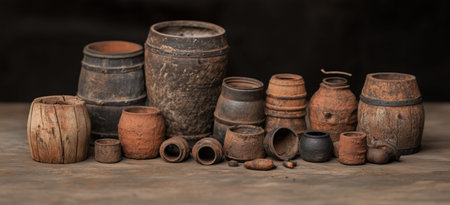 Rustic charm of antique clay jars and weathered wheels displayed outdoors.