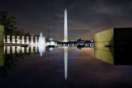 Fountains at the National World War II Memorial and the Washington Monument at night, at the National Mall, in Washington, DC.